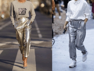 Los metalizados llegan también a las prendas, como pantalones o faldas, integrados en looks neutros.